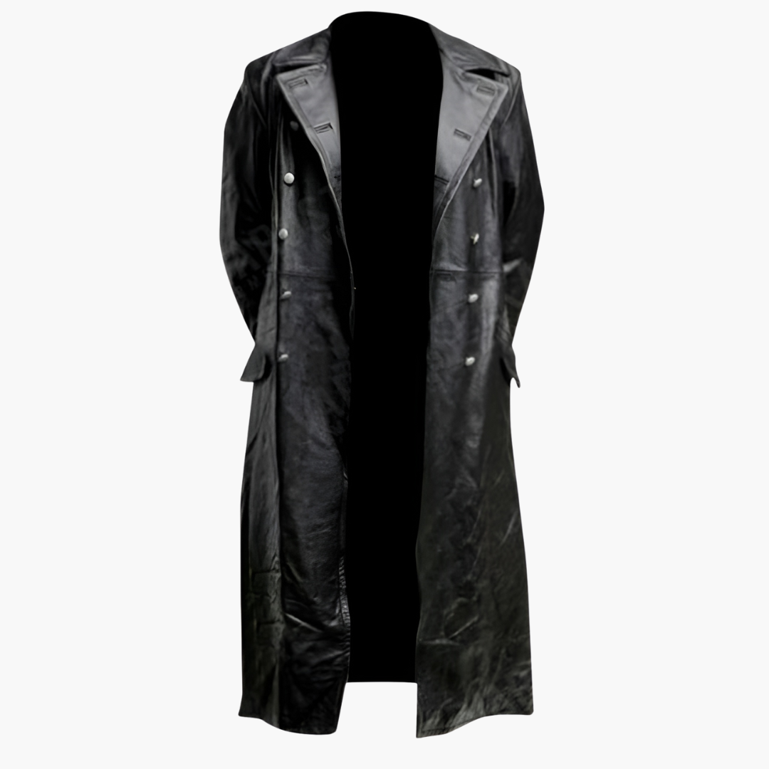 This long men’s coat features a double button row with metallic buttons and a structured lapel. The even surface provides a clean, traditional appearance. Side pockets offer practical usability, while the overall length ensures complete coverage. Suitable for various occasions.