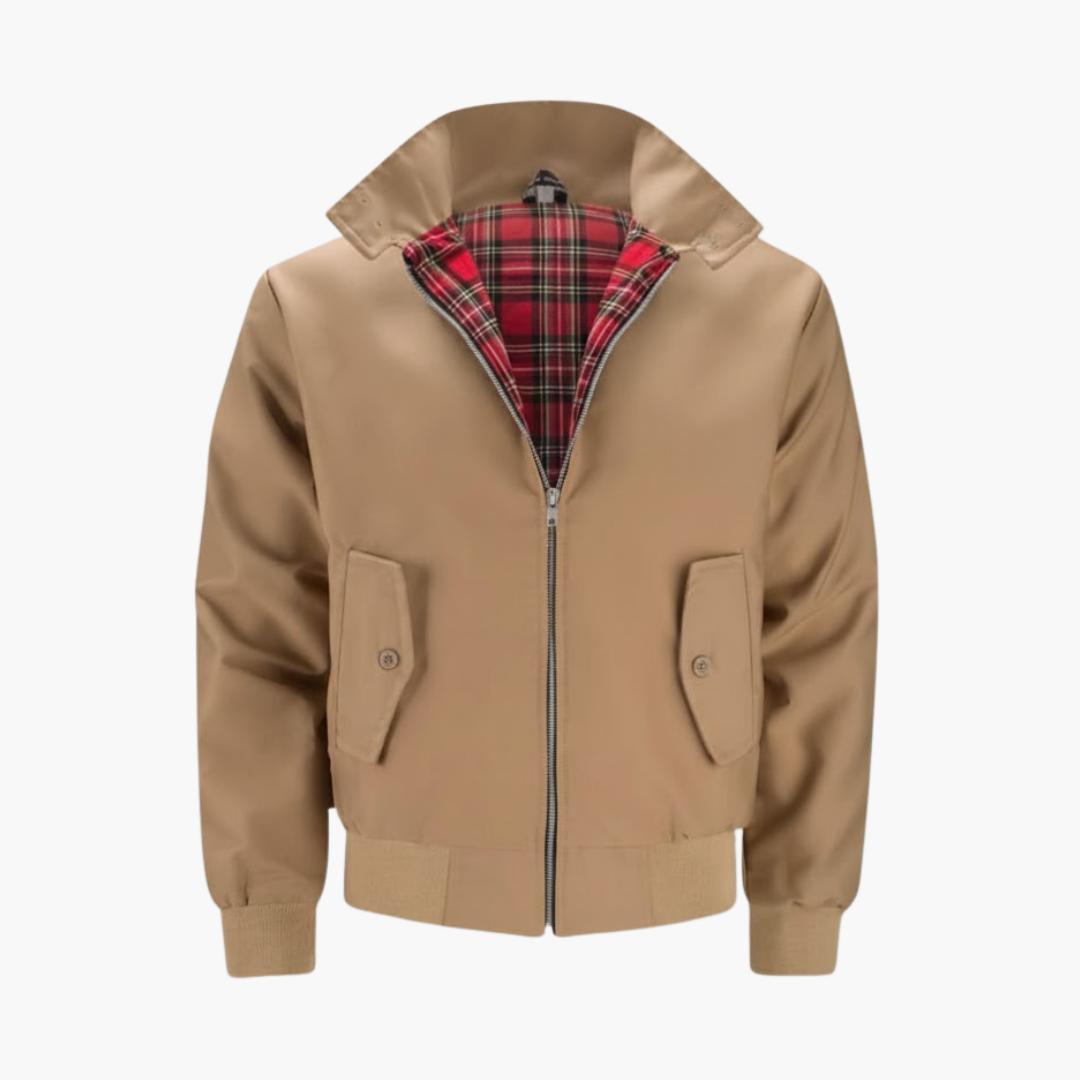 Men’s Harrington Jacket with Ribbed Hem, Cuffs, and Zipper Front.
