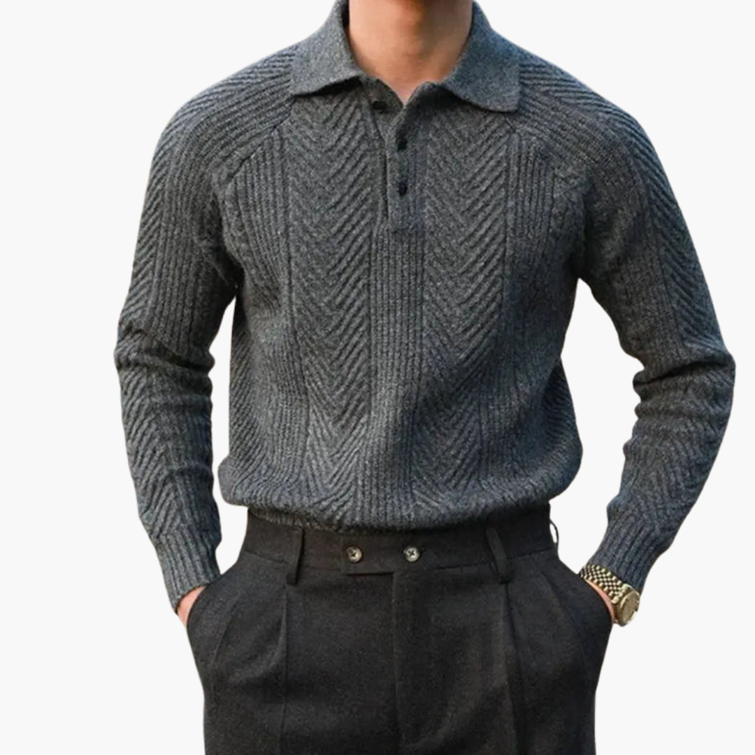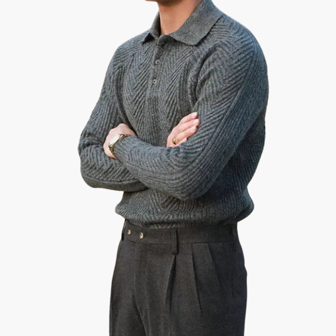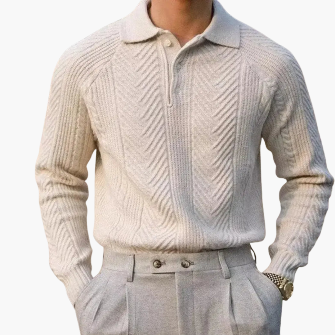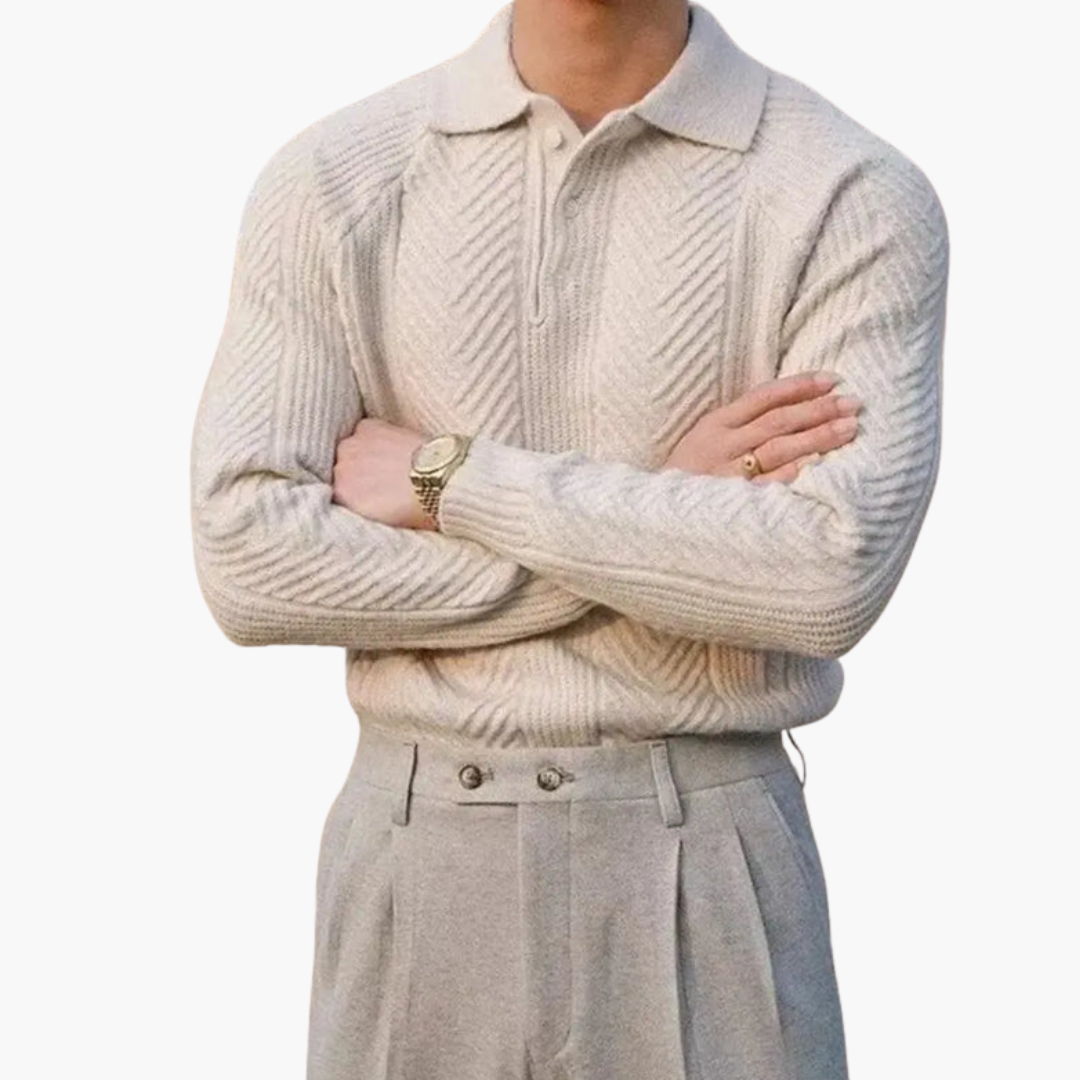This men’s sweater includes a short front zipper beneath the collar and long sleeves. It features ribbed cuffs and a ribbed hemline that help maintain its shape. The surface shows a knitted texture with subtle patterning, offering a refined look ideal for layering during cooler seasons.