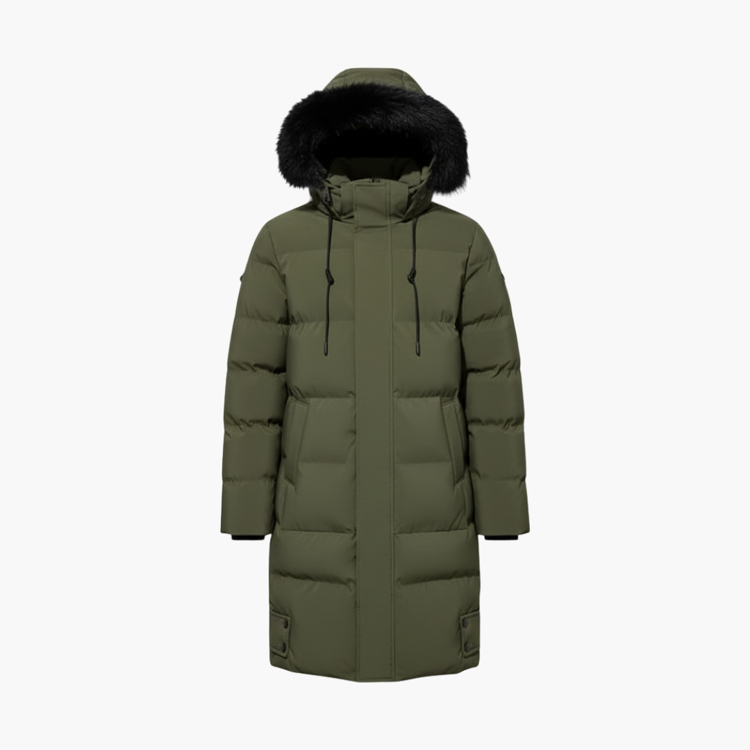 This men’s long jacket includes an attached hood with adjustable drawstrings and a full-length front zipper covered by a storm flap. It features welt pockets at hip level and long sleeves with straight cuffs. The outer surface displays horizontal quilted segmentation extending from the shoulders to the hem.