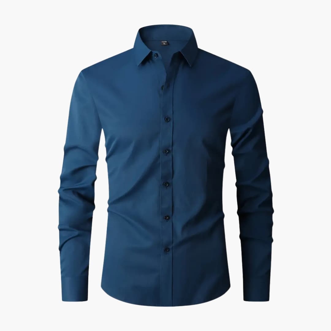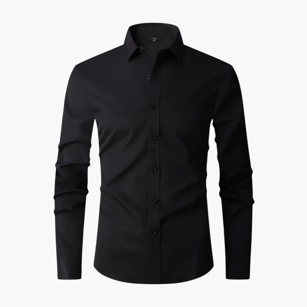 This men’s shirt features a structured collar and a continuous button placket down to the hem. Long sleeves end in straight cuffs. The straight hem provides a defined finish. A simple, woven surface ensures a uniform, consistent appearance across all areas.