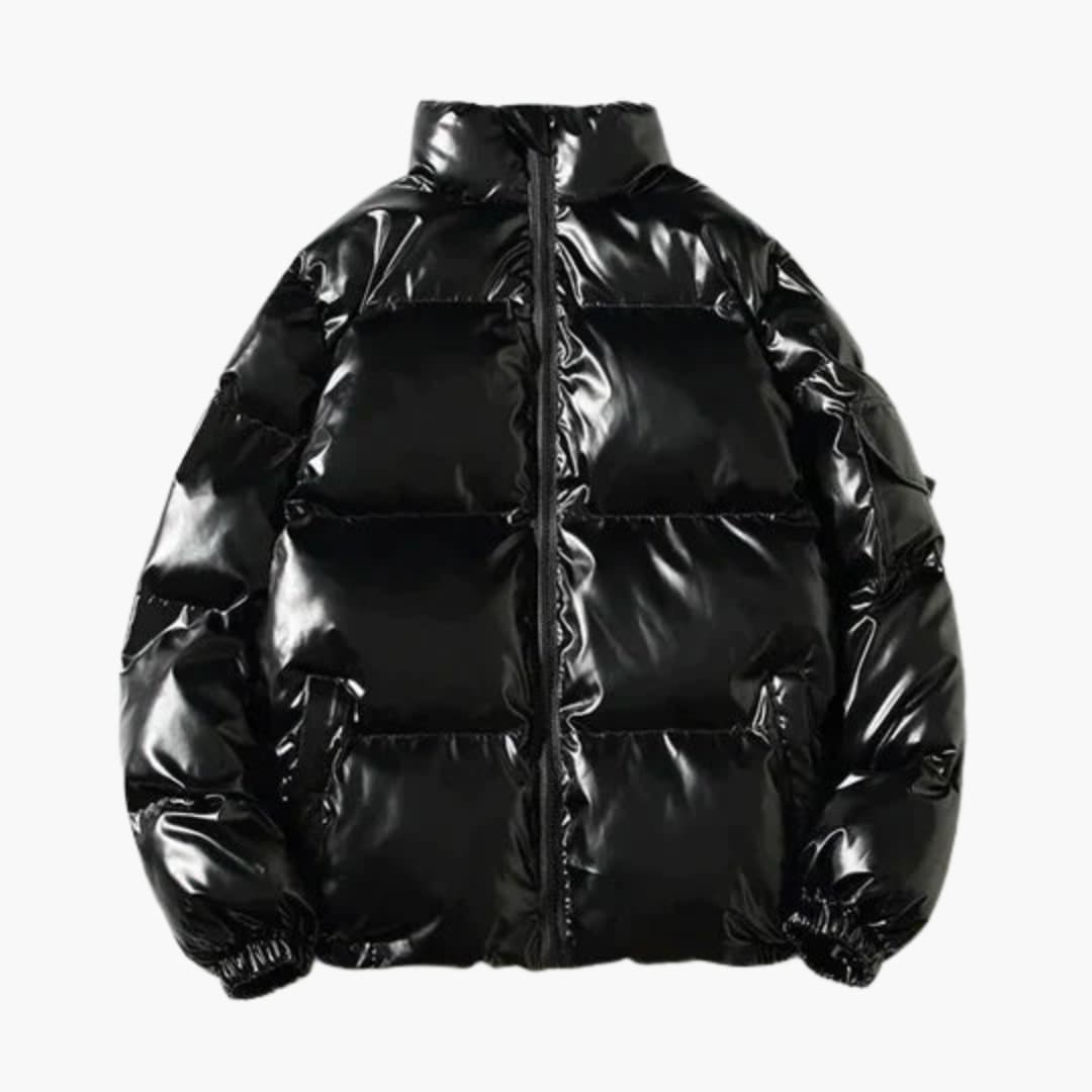 Metallic Puffer Jacket for Men with Hood and Quilted Finish.