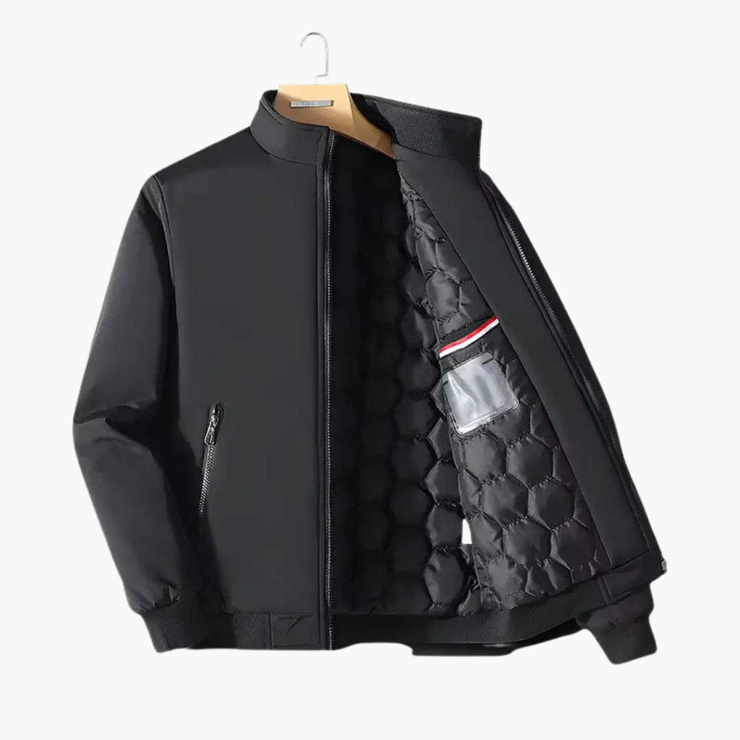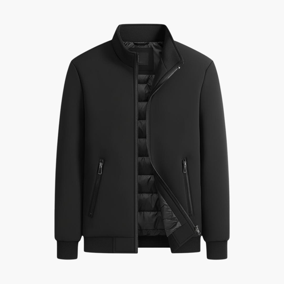 This men’s padded jacket includes a high stand collar, full zip closure, and two side zip pockets. The long sleeves and straight hem provide complete coverage. The outer layer and quilted interior help maintain warmth during colder seasons.