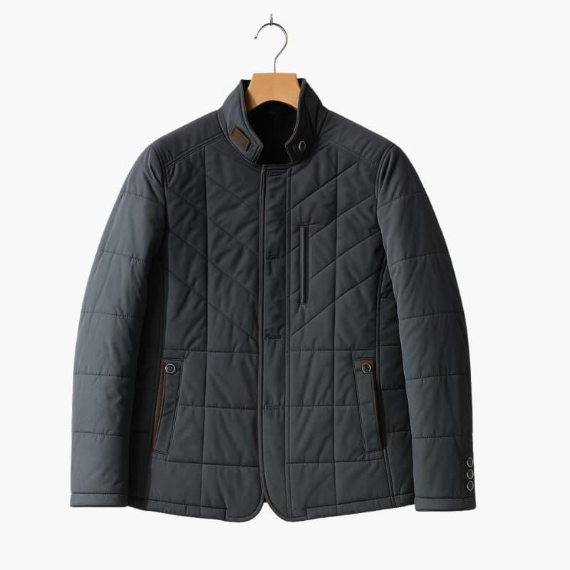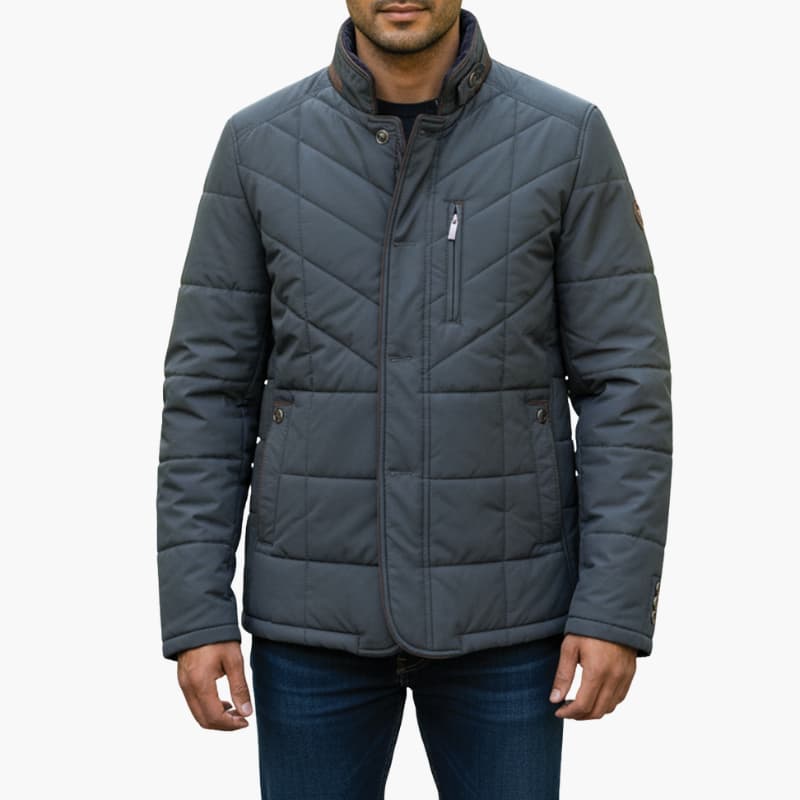 Men’s padded winter jacket featuring a stand collar with contrast lining and a dual button-zipper closure. Designed with side flap pockets and long sleeves. The quilted padded surface provides warmth and structure. Suitable for autumn and winter wear as a practical outer layer.