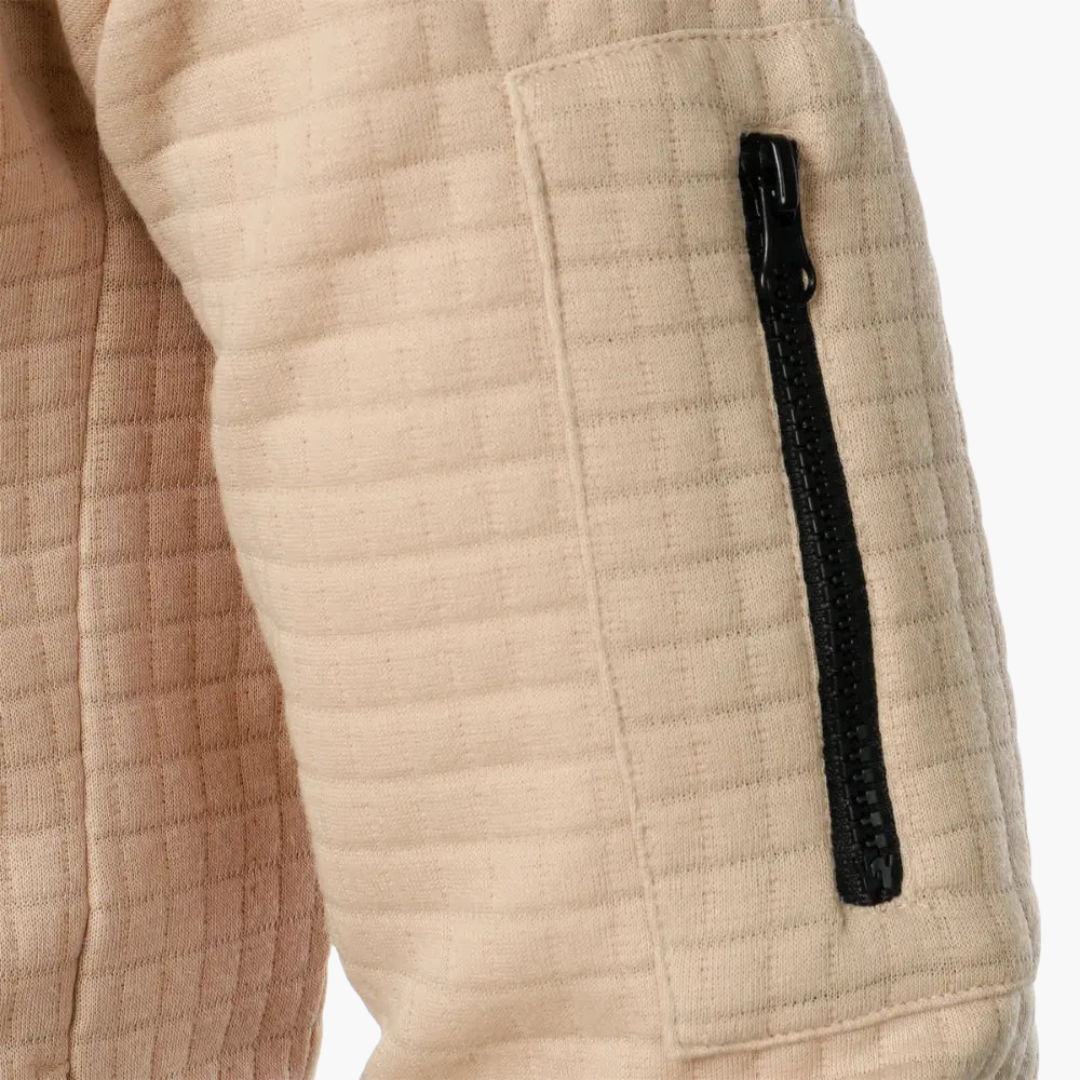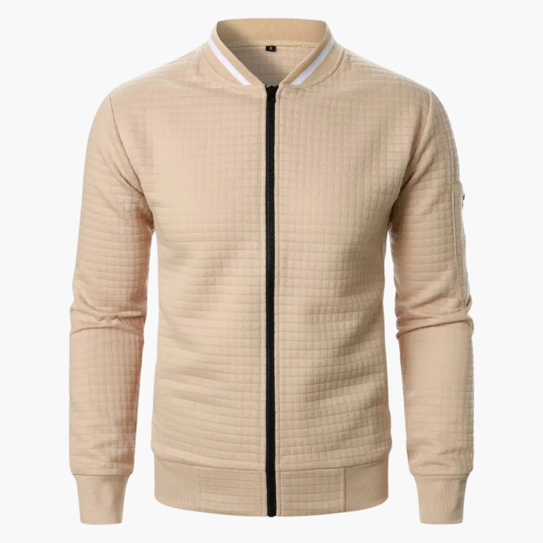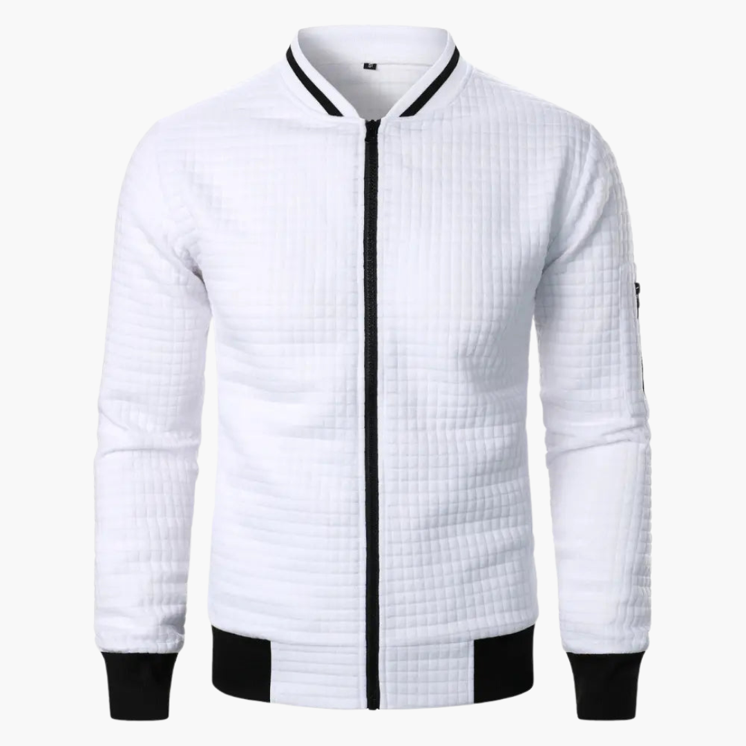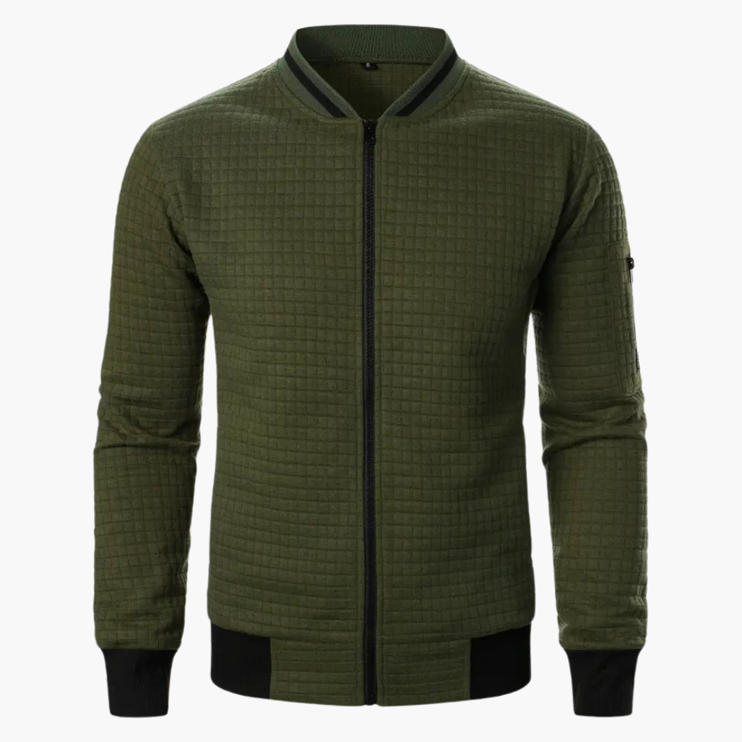 Men’s quilted sweatshirt featuring a zip front and ribbed collar