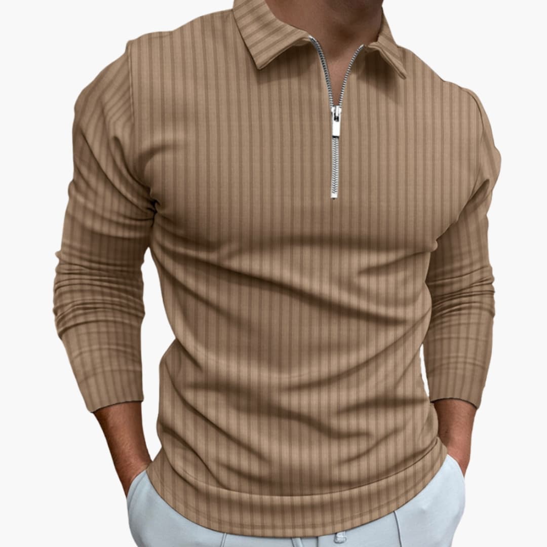 This men’s sweater features a collar neckline with a half-length zipper at the front. The surface is made entirely of vertical ribbed knit, covering both the body and sleeves. With long sleeves and a straight hem, this knit top showcases a clear fit for versatile wear.