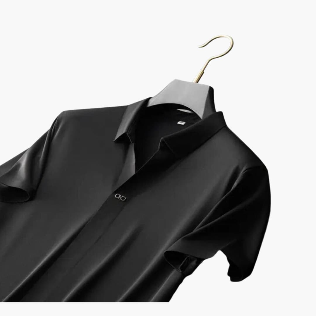 Two-piece set for men featuring a short sleeve shirt with a concealed button placket and collar, as well as slim-fit pants with an elastic waistband and flat front. Made from lightweight fabric for summer use. Breathable and quick-drying – suitable for everyday wear or semi-formal occasions.