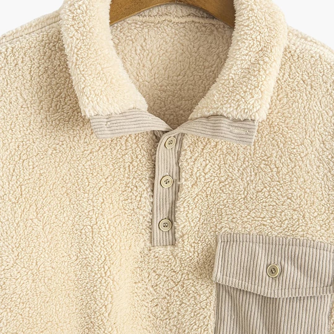 This men’s sweater features a polo collar and is designed to be pulled over the head without any closures. It includes a single chest pocket on the front. The long sleeves end with open cuffs, while the straight hem offers a regular length. The simple woven surface is lined with fleece on the inside.