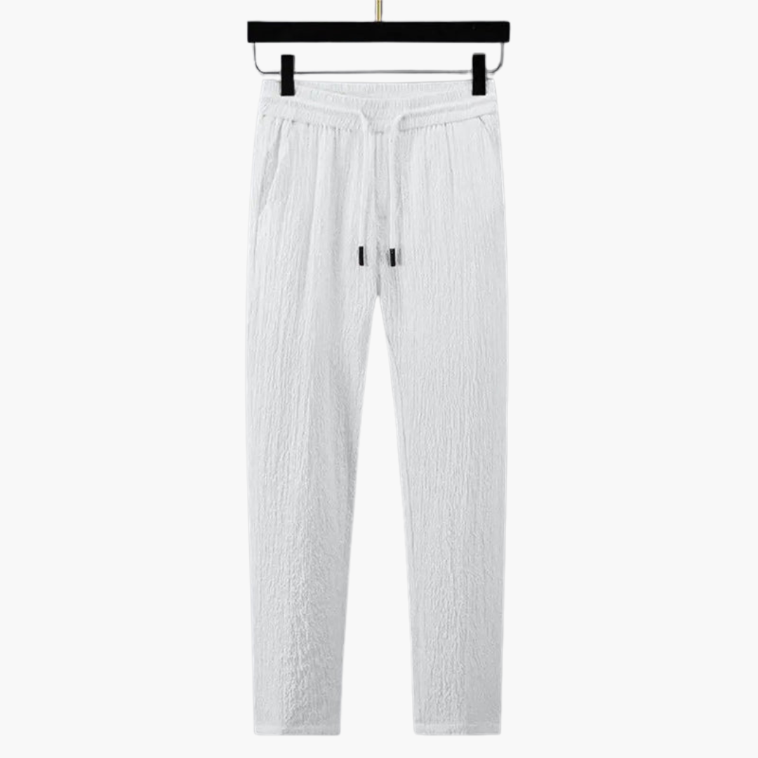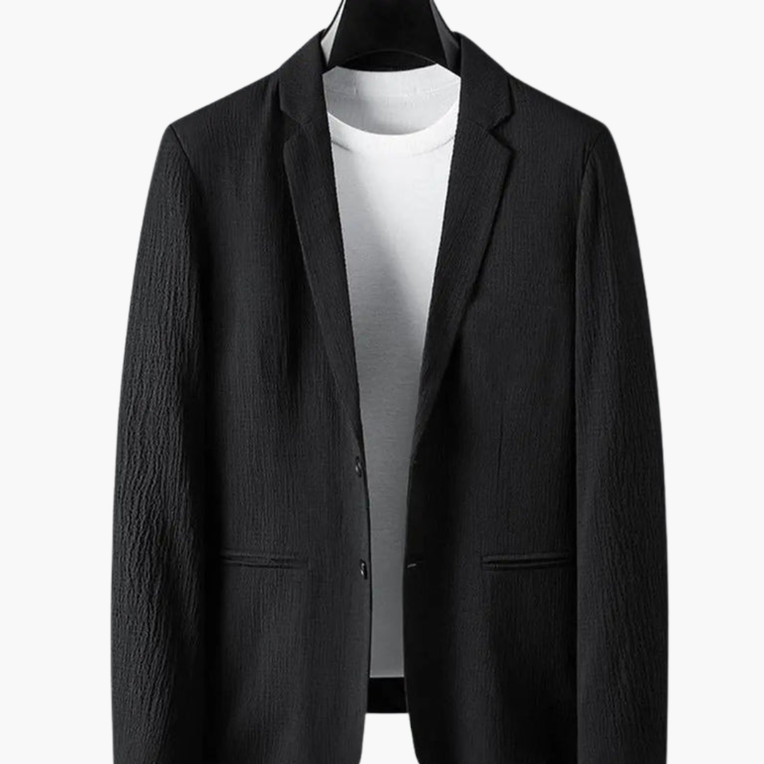This men’s two-piece set includes a single-button blazer and matching drawstring trousers. The blazer has a notched lapel, two side pockets, and one chest pocket. The trousers feature an elastic waistband with adjustable drawstrings for a secure fit. The surface shows a fine textured pattern, making this set appropriate for everyday and semi-formal settings.