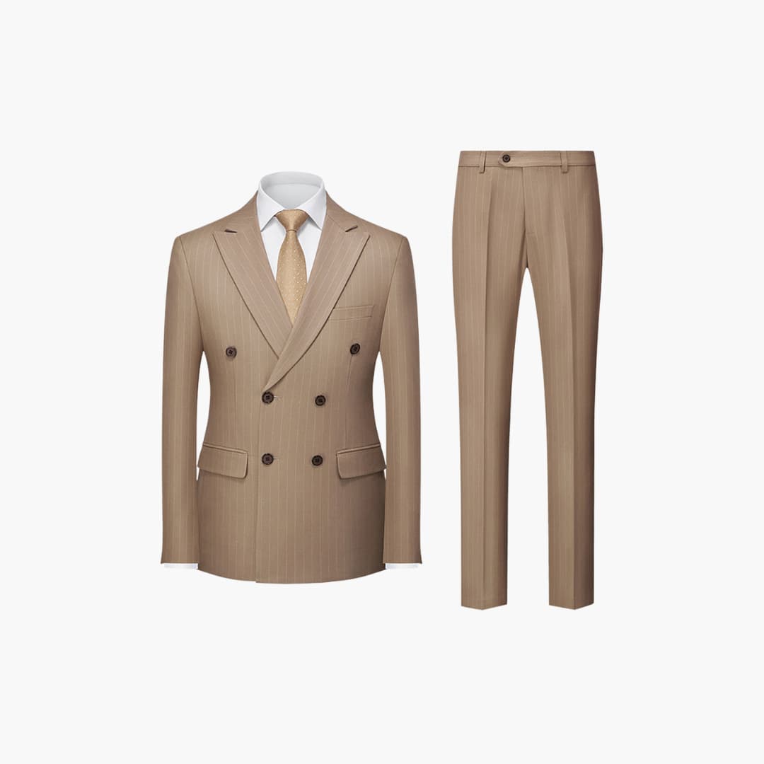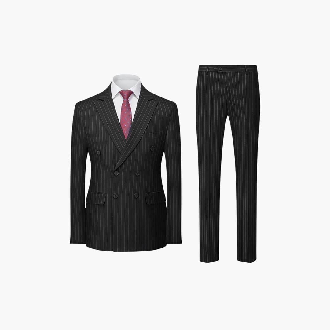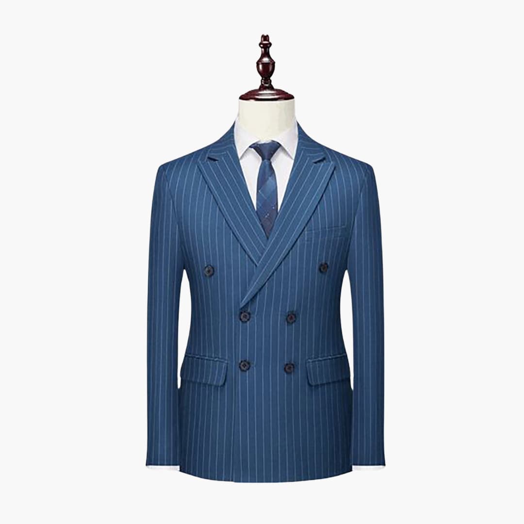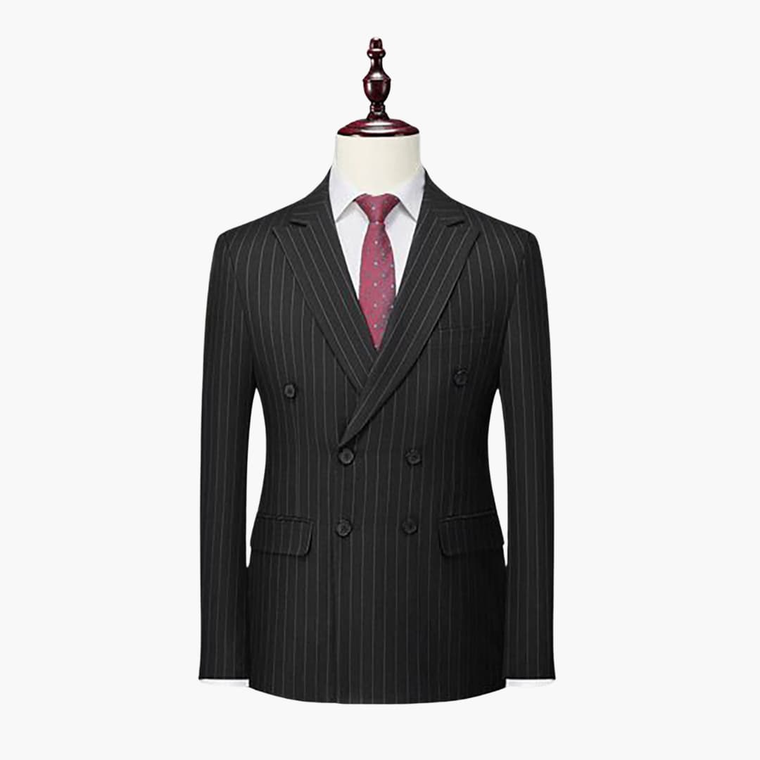 This two-piece men’s suit is made from a lightweight fabric, suitable for year-round wear. The combination includes a long-sleeved, double-breasted jacket with pinstripes, a lapel collar, and flap pockets, as well as matching trousers. The tailored fit is suitable for various formal occasions.