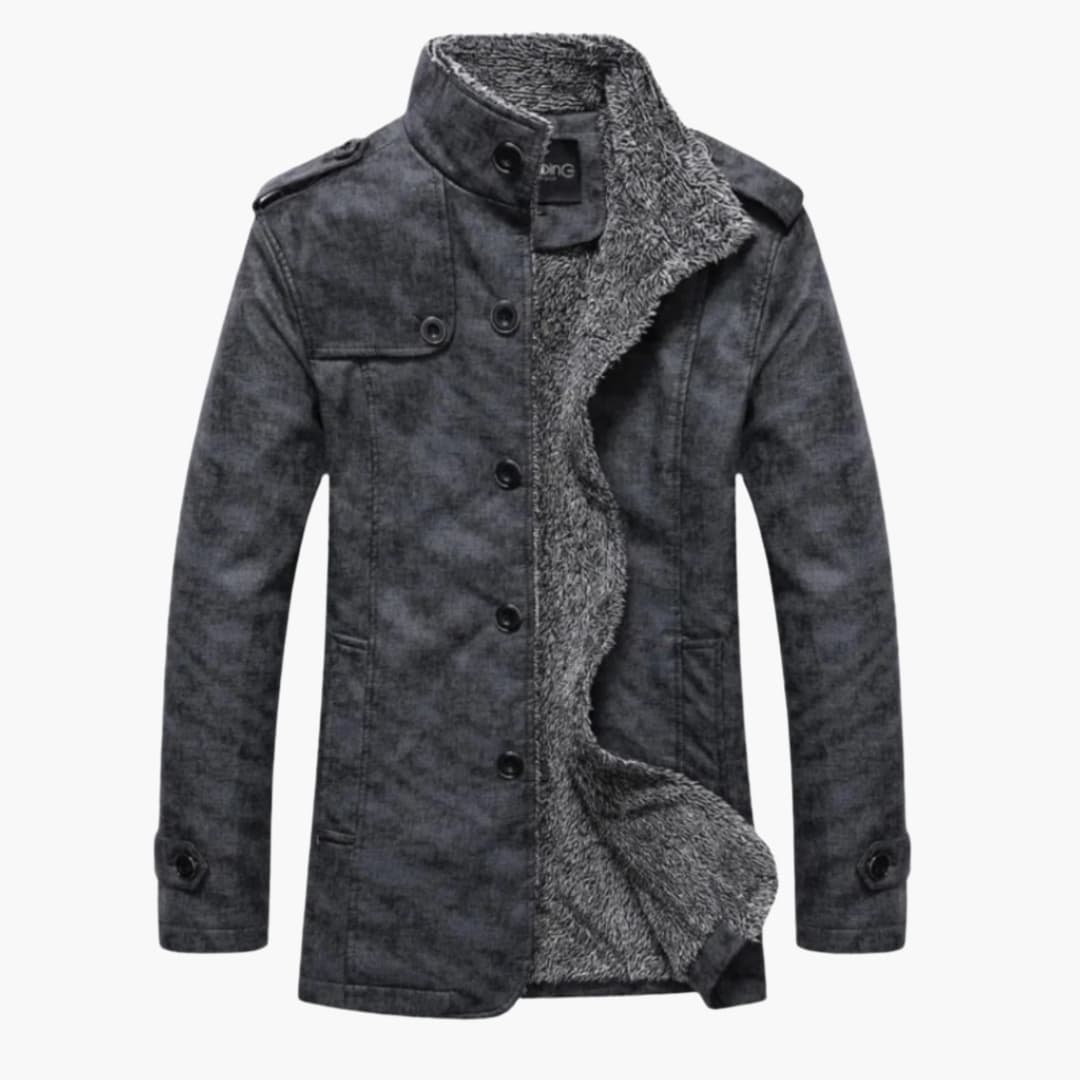 This men’s winter jacket features a high stand-up collar and a full button closure at the front. Two vertical side pockets and a flap chest pocket are integrated on the outside. Long sleeves with buttoned cuffs, shoulder epaulettes, and a straight hem with a simple surface complete the design.