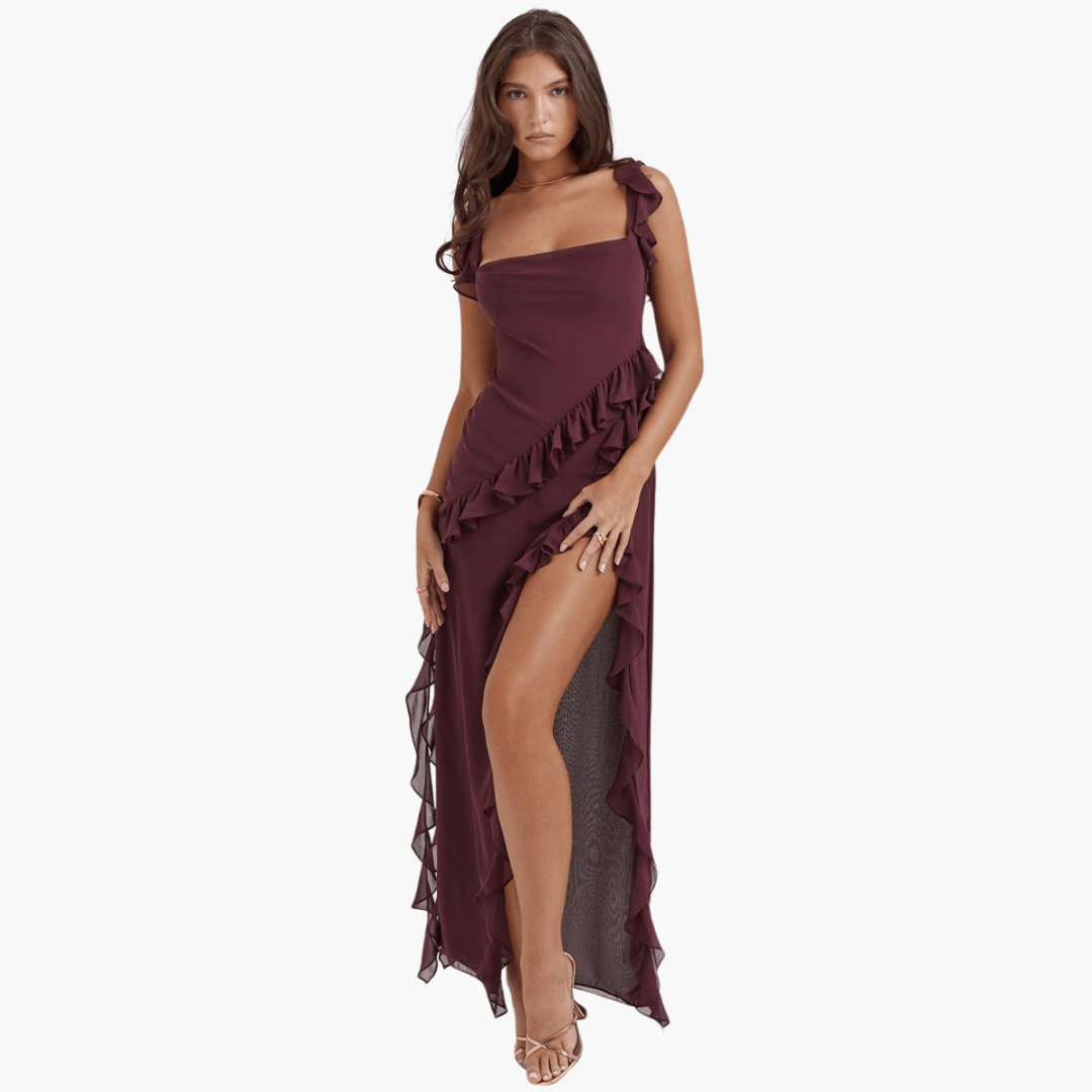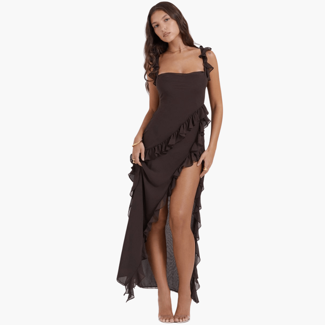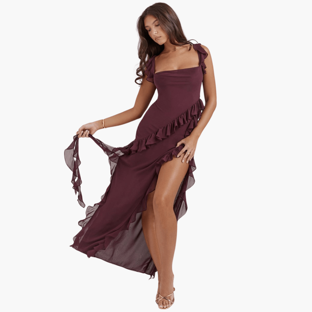 Finding the perfect summer dress that offers both elegance and comfort can be a true challenge. This maxi dress with sophisticated ruffles and a high slit not only ensures an elegant appearance but also gives you the confidence you deserve. Ideal for summer events, romantic evenings, or festive occasions – it will always make you shine!