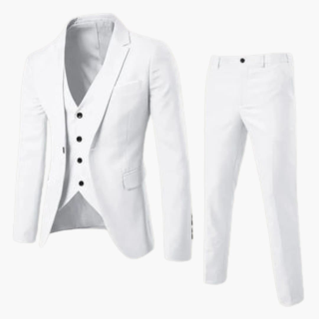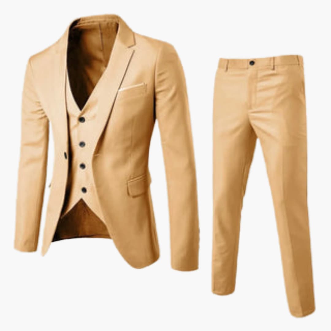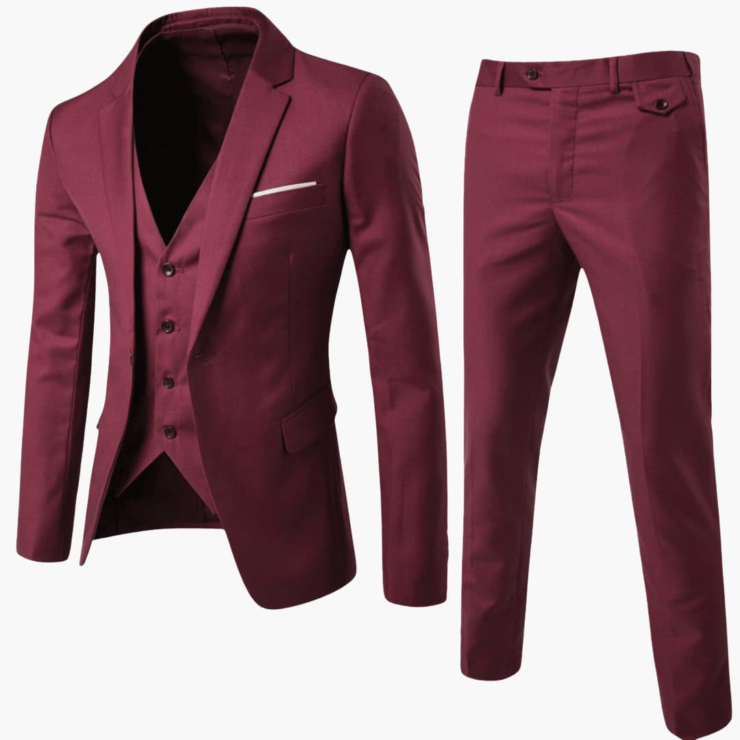 This three-piece suit for men consists of a jacket, a vest, and trousers that are color-coordinated and stylistically matched. The set is designed for formal and festive occasions and impresses with a slim fit, subtle details, and a structured appearance. Suitable for men looking for a polished outfit for special events.