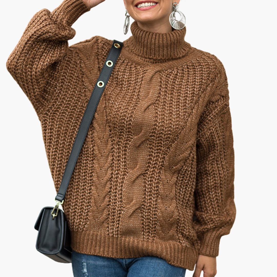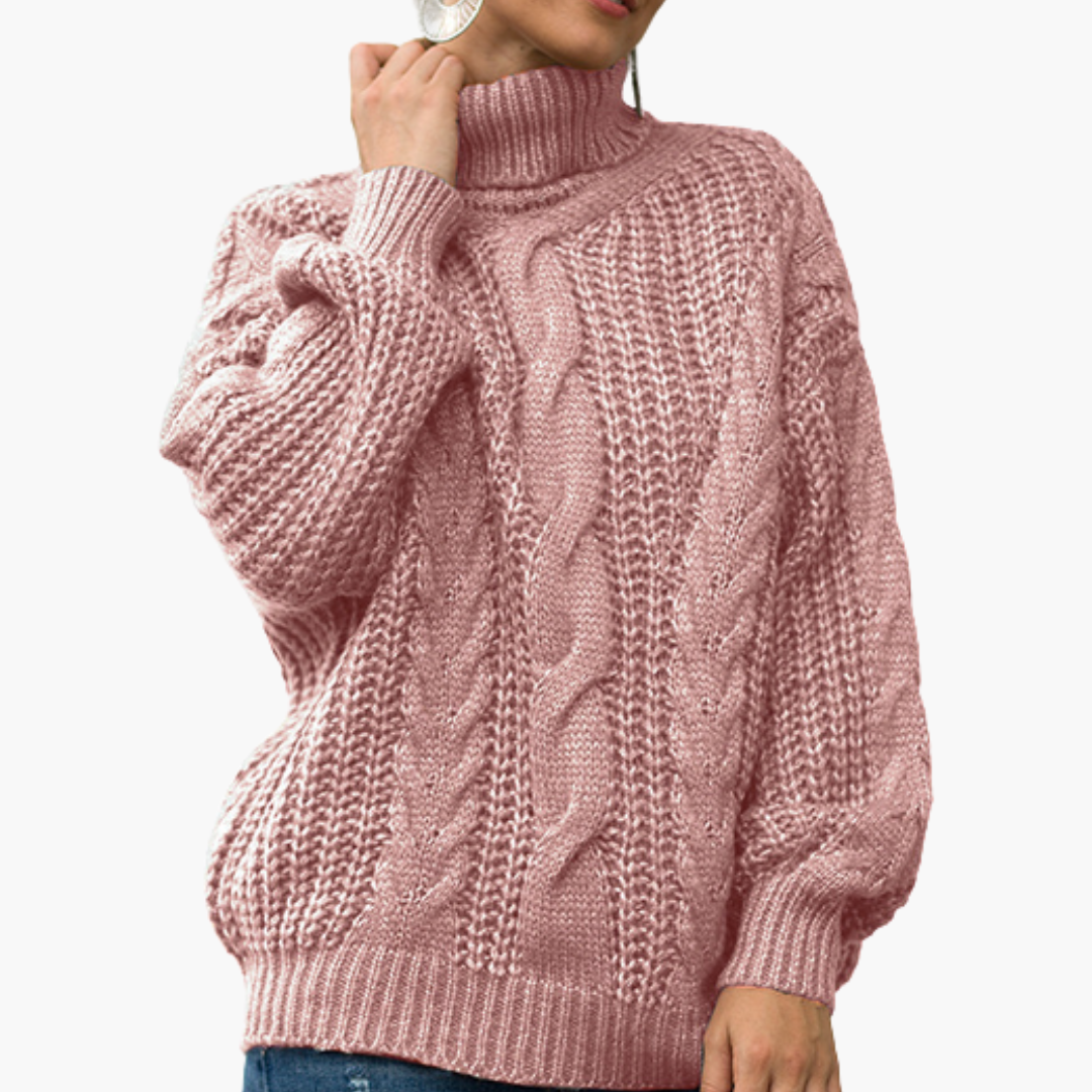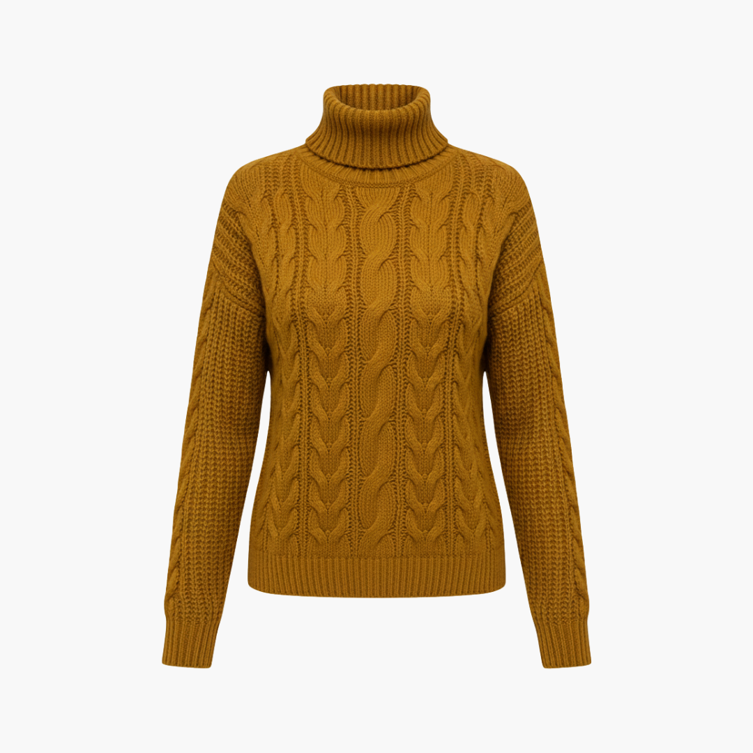 This women’s sweater features a high turtleneck and a thick cable knit texture. The long sleeves include ribbed cuffs that maintain their shape. The slightly rounded hem allows for layering with jeans, pants, or skirts. Ideal for cooler weather and daily wear.