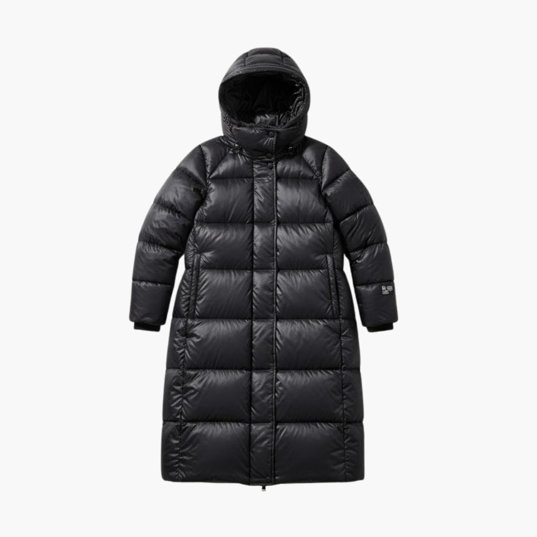 This women’s down coat includes a fixed hood and full-length zipper closure extending to the neckline. The outer surface displays a quilted pattern with evenly stitched sections. The sleeves extend to the wrists and have an inner insulated layer. The inner lining is designed to retain warmth. The hem is long and straight, reaching below the waist for extended coverage.