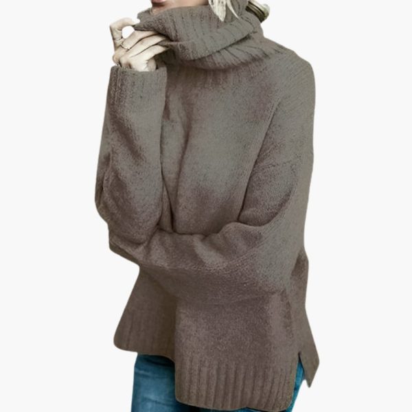 This women’s pullover features a stand-up collar with a functional half-zipper. The surface is consistently adorned with a structured cable pattern. Long sleeves and an oversized fit provide a generous silhouette. The straight hem creates a clear finish and complements the pullover design in a neutral form.