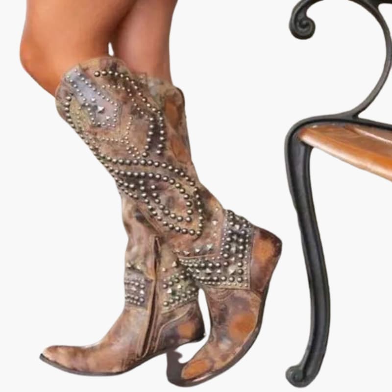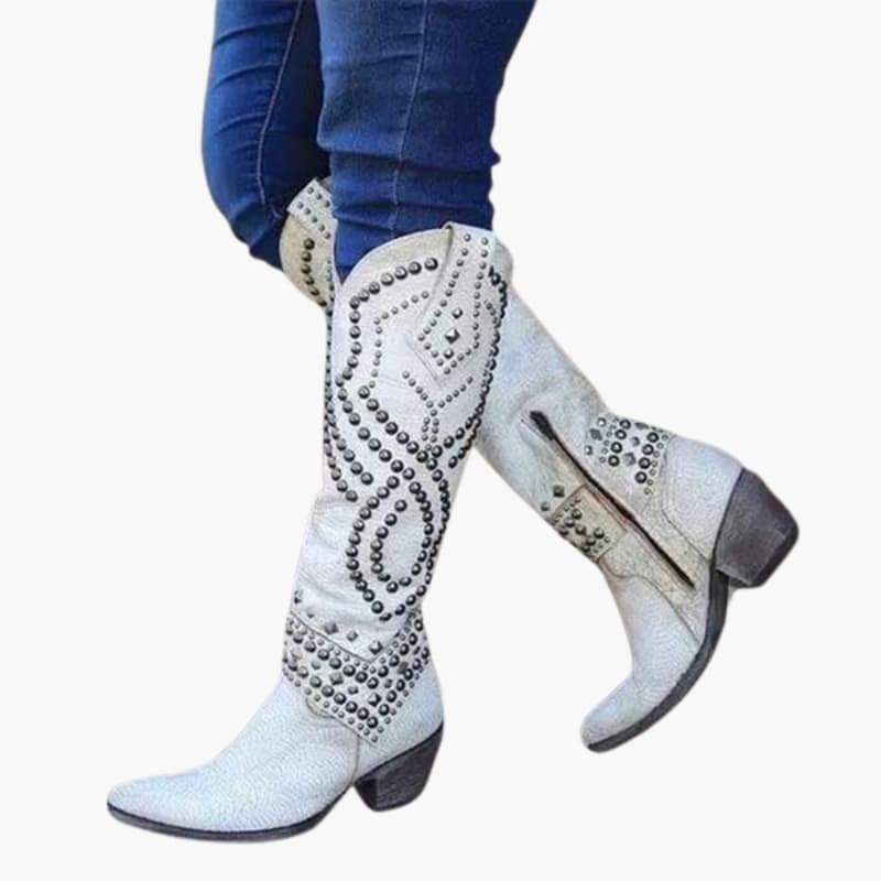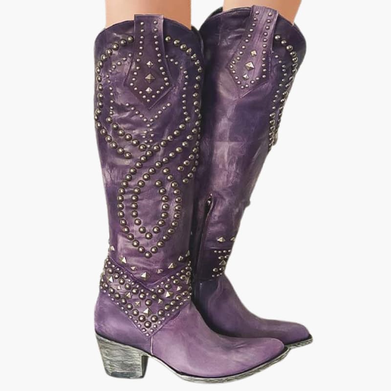 Women’s knee-high boots designed with a pointed toe and side zipper closure. Feature a studded upper surface and a mid block heel for added structure. The outsole provides stability and traction, while the overall profile reflects a western-inspired silhouette suitable for various outfits.