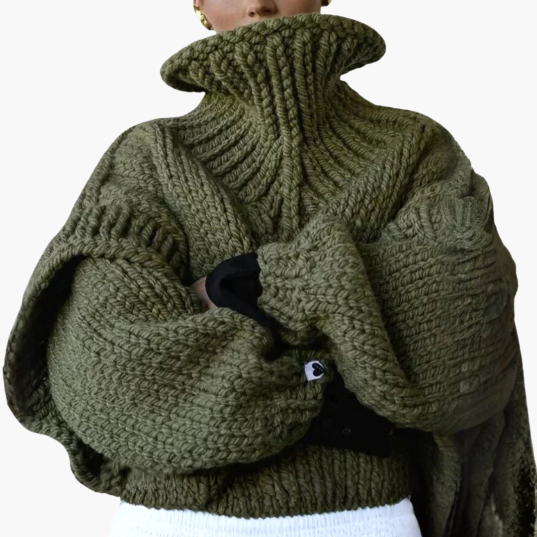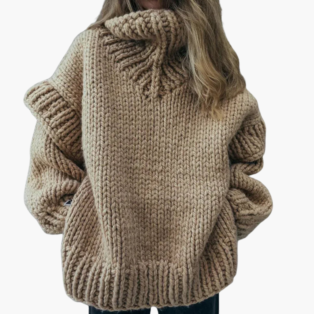This women’s sweater features a high turtleneck and a chunky ribbed knit texture. The oversized shape creates a loose outline with long, wide sleeves and a straight hem. The neckline and cuffs have ribbed details for structure, making this piece suitable for layering in cooler weather.