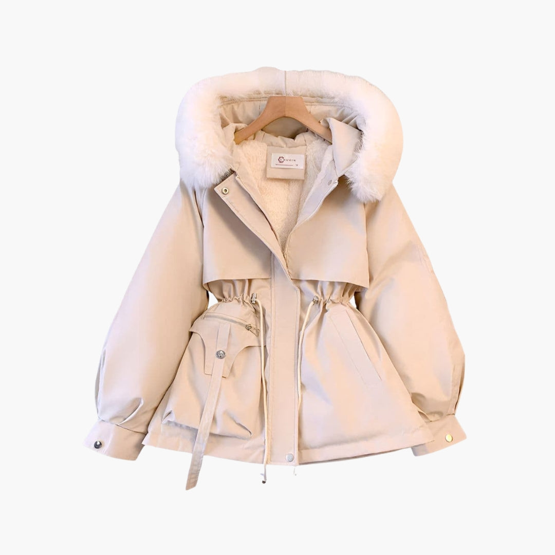 This women’s parka features a high collar with a hood and red faux fur trim. The front closure includes a zipper and snap button placket for secure fastening. Side flap pockets with zippers provide storage, while an adjustable waist drawcord ensures a perfect fit. The straight hem with woven surface gives a clean, structured finish.