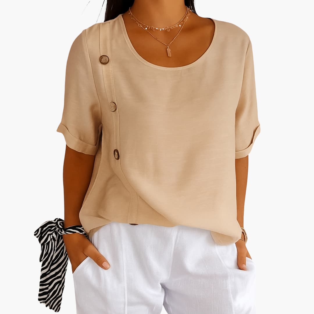 Women’s blouse made from lightweight fabric, suitable for year-round wear. Designed with short sleeves and rolled hems, this top features a round neckline and side button details. The loose fit allows for easy pairing with casual or semi-formal bottoms. Ideal for everyday use, the office, or casual occasions throughout the year.