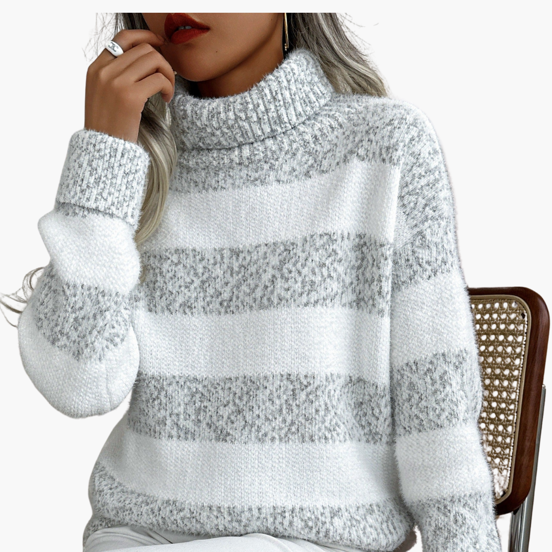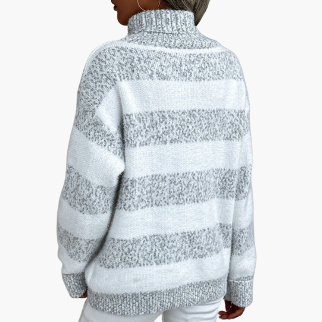 Women’s Striped Turtleneck Sweater with Long Sleeves and Ribbed Edges