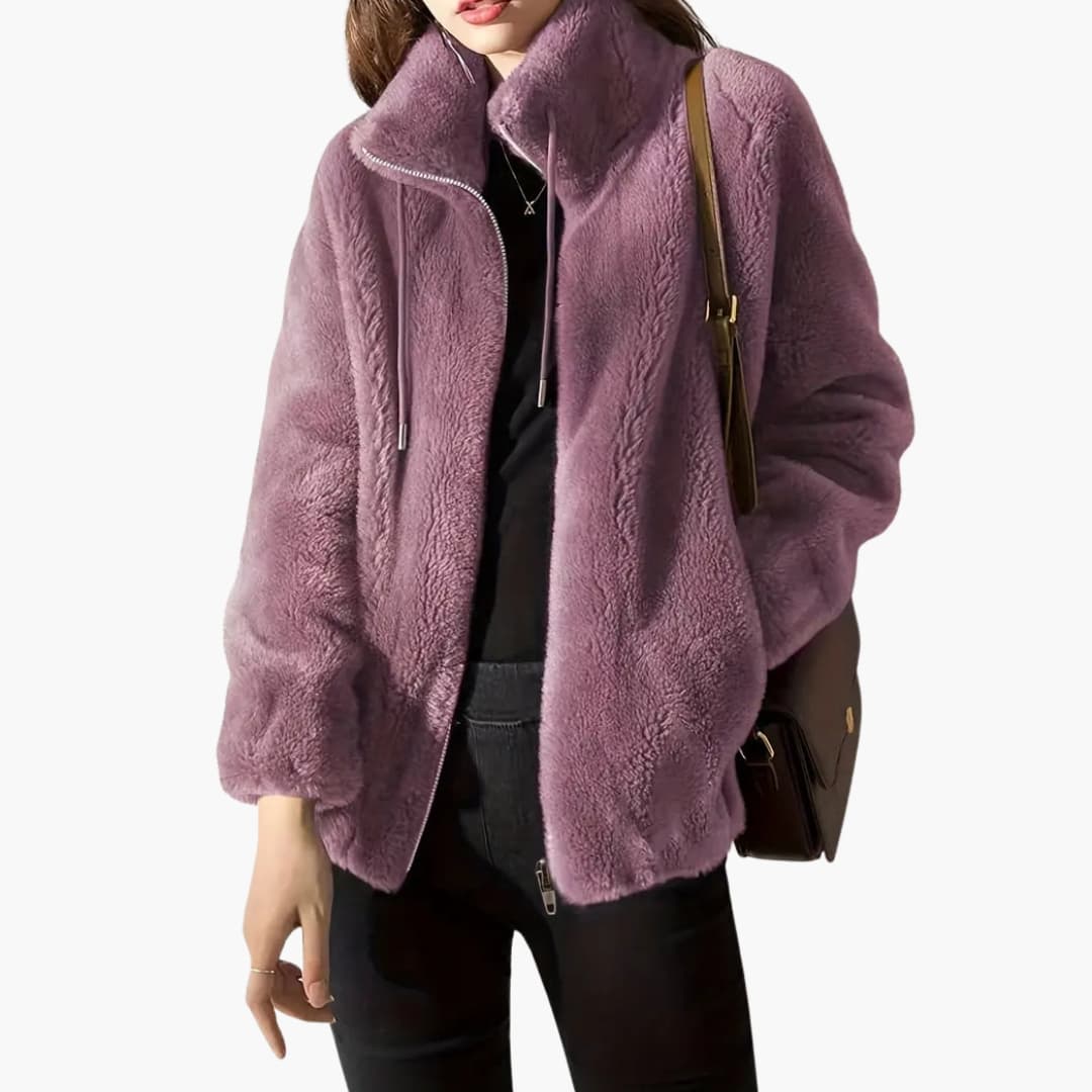 This women’s teddy coat includes a high collar, front zipper and long sleeves. The hem features an adjustable drawstring for preferred shaping. The exterior shows a textured teddy surface with a uniform appearance. The straight cut allows layering for cooler seasonal conditions.