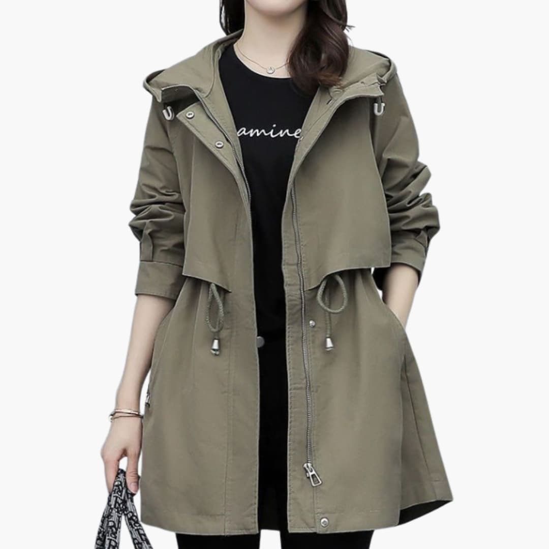 This women’s trench coat includes a hooded neckline and a front zipper closure. An adjustable drawstring waist allows fit modification, while two side pockets provide storage. Designed with long sleeves and a straight hemline, the coat is made from plain-woven material with a consistent surface. The structured outline is suitable for use across different settings.