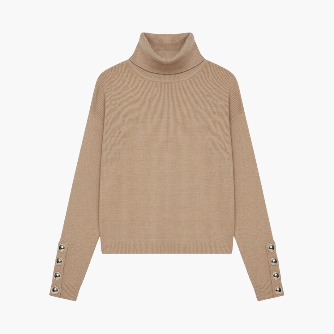 Women’s Turtleneck Sweater with Decorative Sleeve Buttons and Long Sleeves